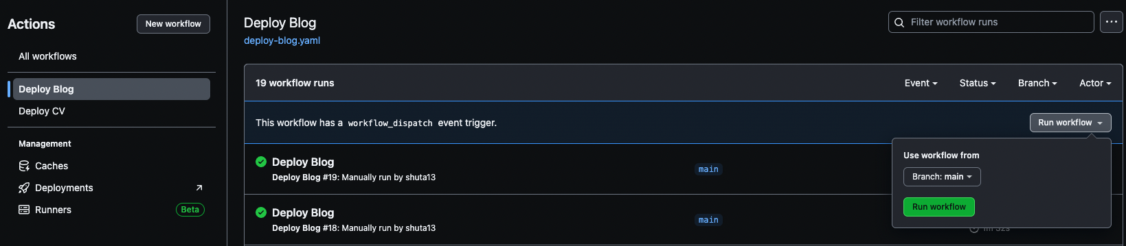 こんな感じで Run Workflow ボタンを押すとブログのデプロイが走ります。